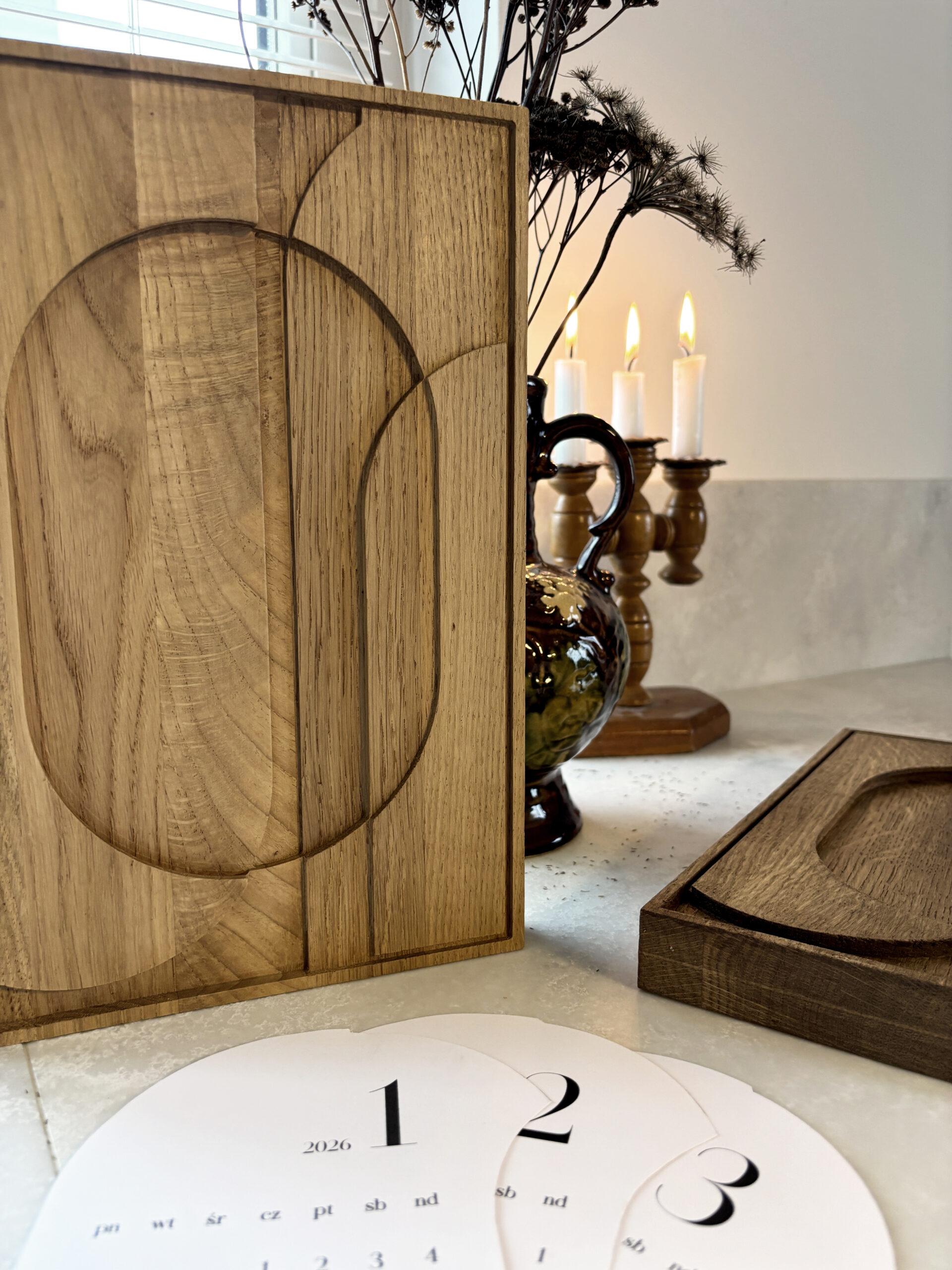 Obraz z drewna dębowego, który może stać się wiecznym kalendarzem. Płaskorzeźba z dołączonymi kartami miesięcy na 2026 rok.
